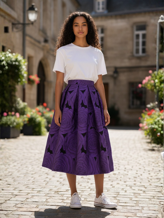 Luxurious Black Jacquard Puff Skirt- Autumn Floral A-Line Midi Skirt(SAW0019)